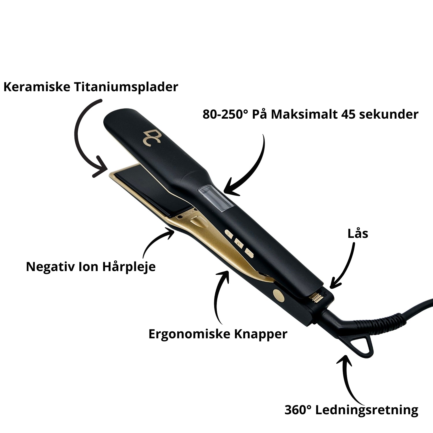 360° grader ledningsretning med en længde på hele 2.5m sikrer, at ledningen aldrig vikles ind i noget, og du helt frit kan bruge Glattejernet uden besvær.