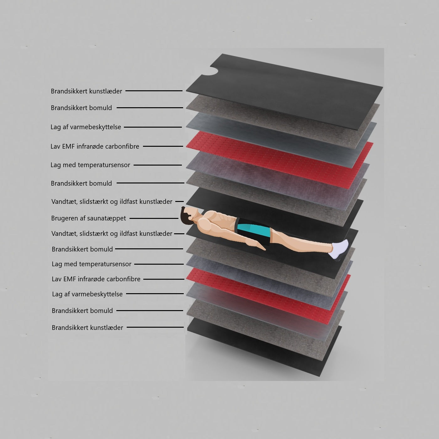 Du kan se en uddybning af lagene på billedet. Det er carbonfibre under og over kroppen, som generer den infrarøde varme til hele kroppen og giver den ultimative wellness oplevelse.